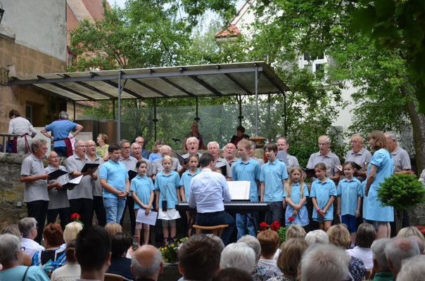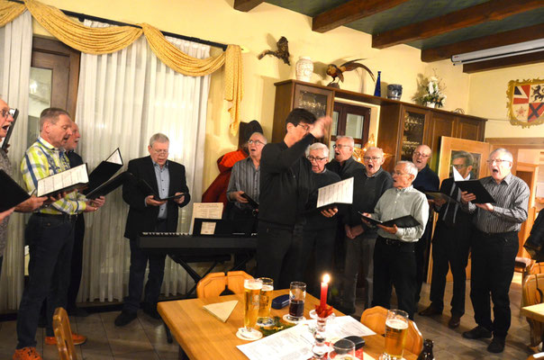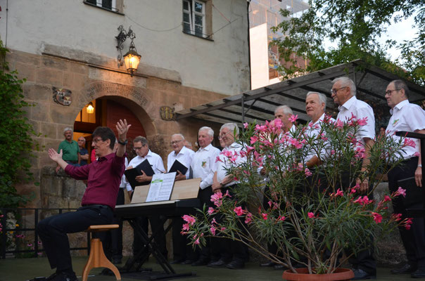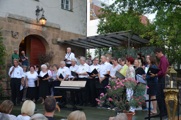 im Biergarten des Vereinslokales Gasthof Meisel versammelten Sänger waren ohnehin gern gesehene Gäste bei der Feier und brachten dem Jubilar und „Altvorstand“ unter der Leitung von Chorleiter Udo